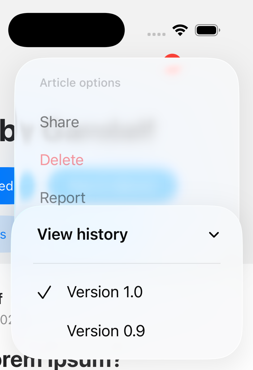 changesSelectionAsPrimaryAction: Whether the menu is a selection menu. Tapping an item in a selection menu will add a checkmark to the selected item. Defaults tofalse.menu: An object containing the menu items. It contains the following properties:title: Optional title to show on top of the menu.multiselectable: Whether multiple items in the menu can be selected (i.e. in "on" state). Defaults tofalse.layout: How the menu items are displayed. Supported values:default(default): menu items are displayed normally.palette: menu items are displayed in a horizontal row.